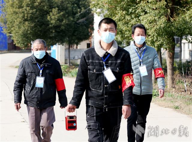 2月12日,祖孙三代人都是共产党员,在村湾巡查,宣传、值守疫情防控。