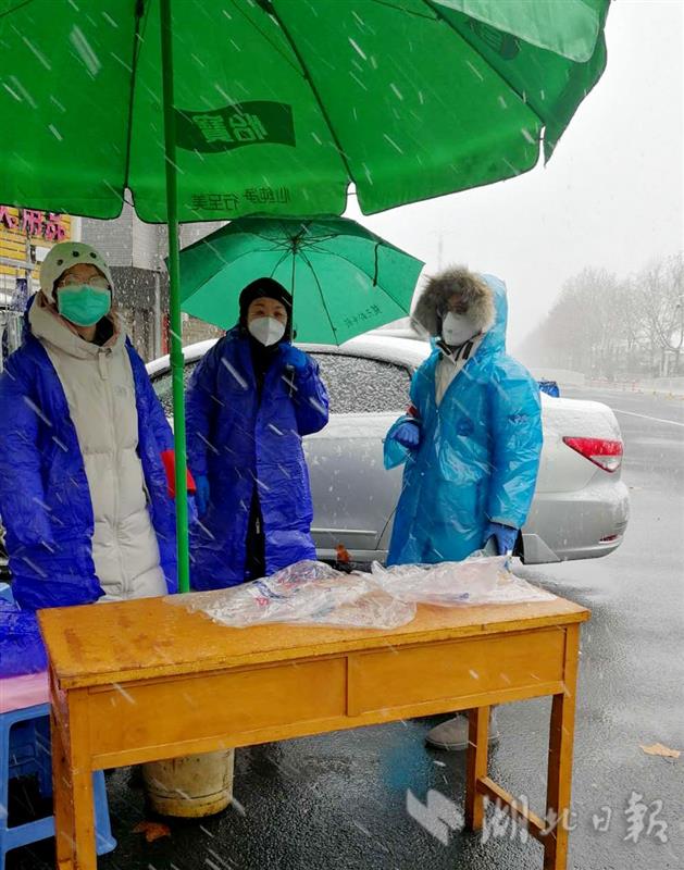 2月15日,硚口区委下沉女干部雨雪中坚守在社区防疫。