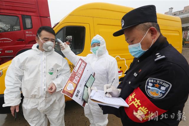 3月9日,共产党员民警佘太平和黄利芬夫妻同岗在汉鄂316国道疫情防控阻隔点共同战疫。