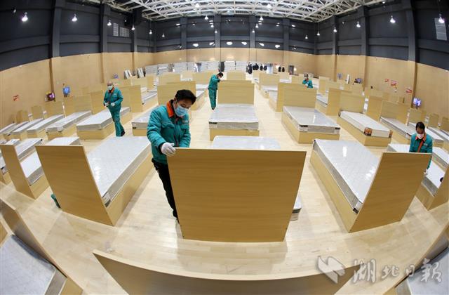 2月5日凌晨开始,江夏区政府组织连夜在大花山户外运动中心搭建1000张床位的“方舱医院”。