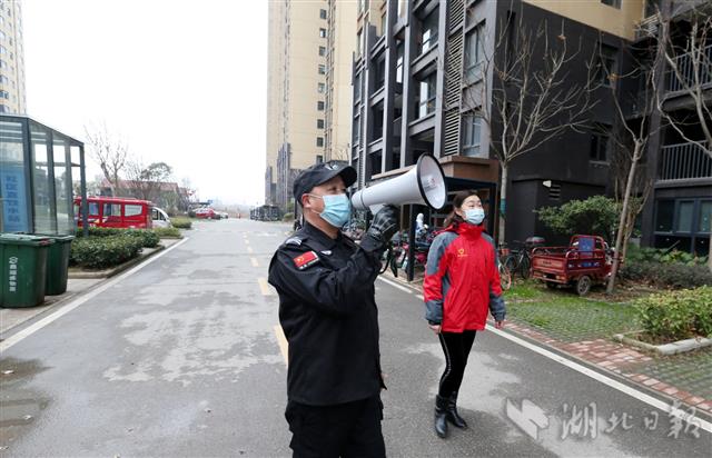 1月27日,武汉东湖高新技术开发区智苑社区干部和安保人员,白天不间断地用"小喇叭"宣讲防控疫情知识,强化居民防控意识。