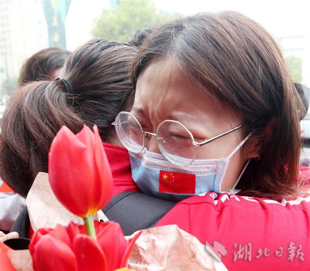 3月22日,上海市第三批援鄂医疗队队员与一起抗疫的武汉队友深情拥抱依依泪别。