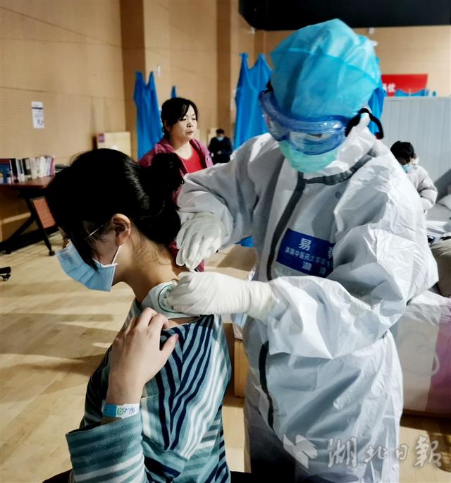 2月17日,湖南省援鄂医疗队员在江夏方舱医院运用中医理疗精心治疗新冠肺炎轻症患者。