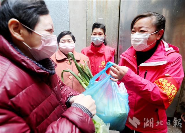 3月7日,武汉市武昌区起义门社区党员志愿者、党委书记魏玉萍(右)上门为辖区71岁的王婆婆送去生活物资。