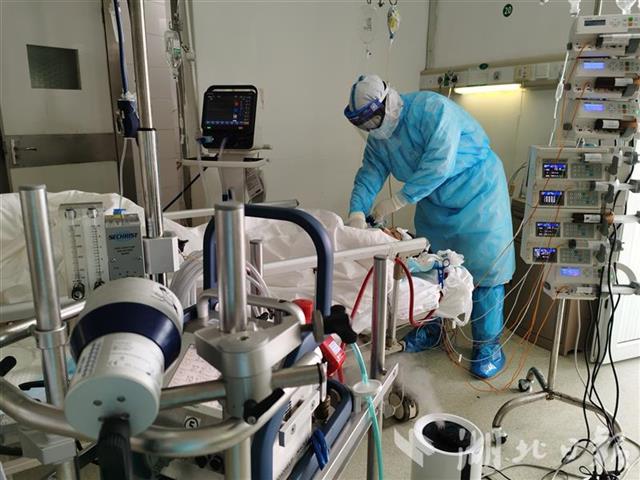 3月30日上午,金银潭医院南5楼危重病区,连续14天使用ECMO(体外人工膜肺)后,患者彭先生心肺功能终于重启。由于卧床太久,下床走路时,他的脚底板“像机器人一样”,只能平行移动。