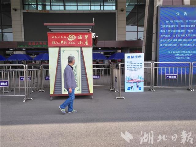 位于西广场的进站口全部封闭,两块大屏上,显示着省新冠肺炎疫情防控指挥部公告内容:自4月8日零时起,武汉市解除离汉离鄂通道管控,有序恢复对外交通,离汉人员凭湖北健康码“绿码”安全有序流动。门口显眼位置还放有提示牌,提醒旅客主动配合健康码核验和体温测量,并注意排队间距、全程佩戴口罩。