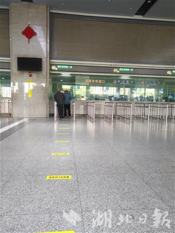 整个售票大厅空空荡荡,只有三三两两几个人,窗口也只开了两个,一个办理售票,一个办理退票。每个窗口均有滚动字幕,地面也都贴有黄条,提示购票者保持1米距离。