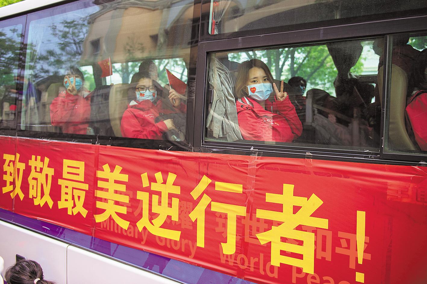 4月6日,武昌理工学院,上海援鄂医护人员乘专车前往武汉天河机场。当日,上海第八批援鄂医疗队472名队员离汉返沪。据了解,上海第八批援鄂医疗队共计521名队员,自2月19日驰援雷神山医院以来,共有326名新冠肺炎患者在他们精心救治下康复出院。(湖北日报全媒记者 蔡俊 摄)