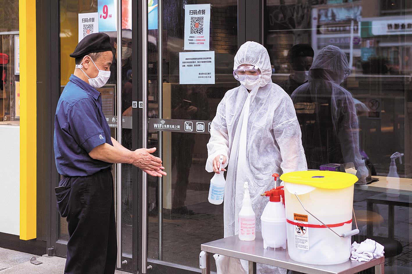 4月6日,武汉市江汉路步行街,工作人员在门口设立检测点,对进出人员测量体温并消毒。