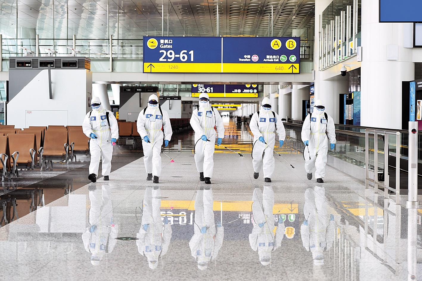 4月3日下午,武汉天河国际机场T3航站楼进行封闭式卫生防疫消杀,由武汉市消防救援支队派出161名队员执行。4月8日,天河国际机场国内客运航班将恢复运营。 (湖北日报全媒记者 李溪 摄)