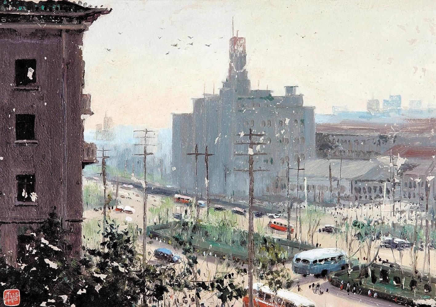 钱延康 《汉口解放大道的早晨》 油画 24×35cm 1959年