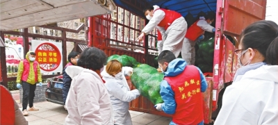 3月3日,社区志愿者们在给宅在家里的居民们分发新鲜蔬菜