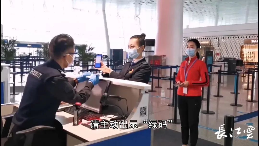 (一)进入航站楼前,请扫描“武汉战疫”二维码,凭“绿码”通行;没有申领湖北健康码的老人和未成年人,凭社区(村)开具的健康监测证明通行。