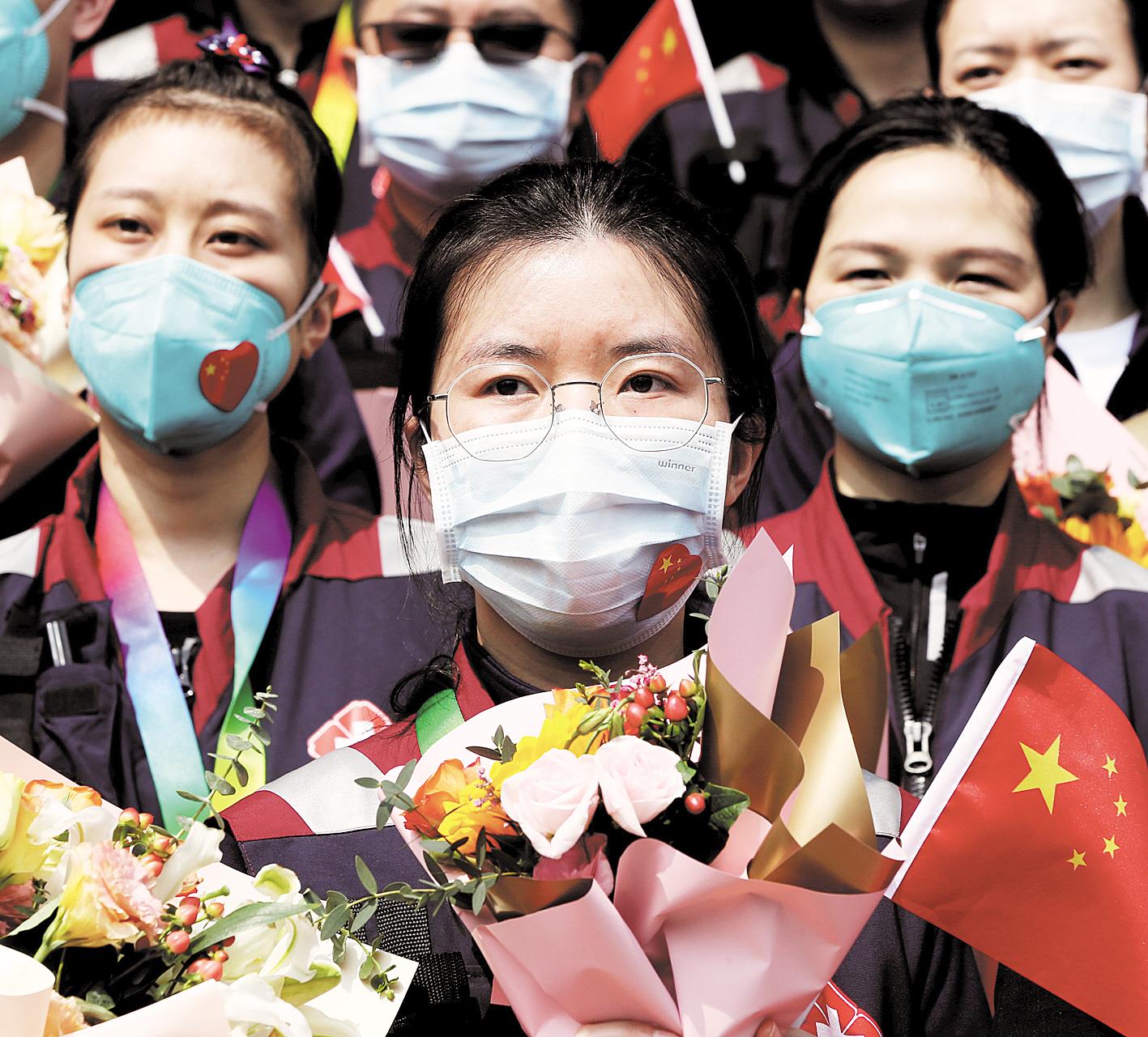 4月7日,四川第三批援鄂医疗队队员曾婷(中)与武汉的战友依依惜别。这批162名援鄂医疗队员2月7日抵达武汉,主战武汉大学人民医院东院,连续工作60天,圆满完成救治任务,荣获了“全国卫生健康系统新冠肺炎疫情防控工作先进集体”称号。