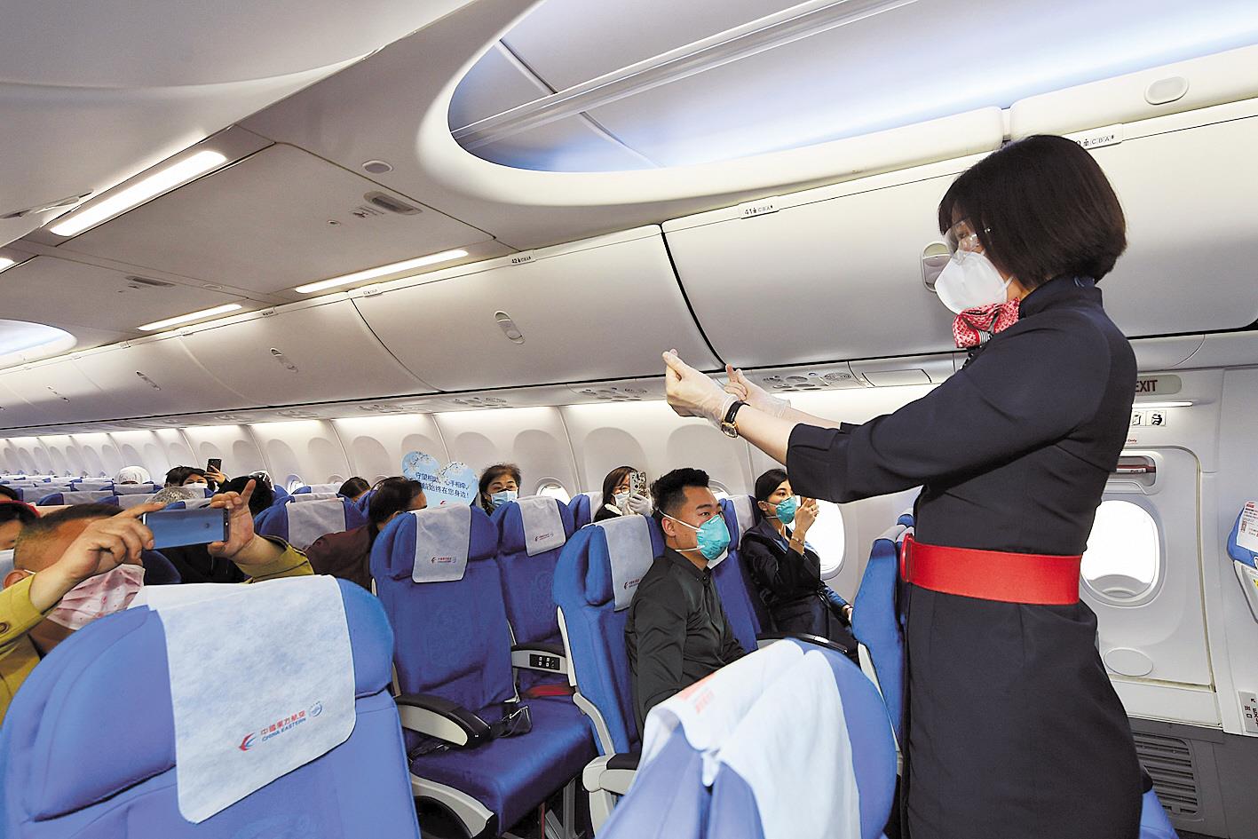 4月8日7时24分,东航MU2527武汉飞三亚航班起飞,成为武汉“解封”后首个客运航班。机上载客49人,多数为来汉探亲返乡人员。图为空乘人员为旅客表演手指舞。(湖北日报全媒记者 李溪 摄)