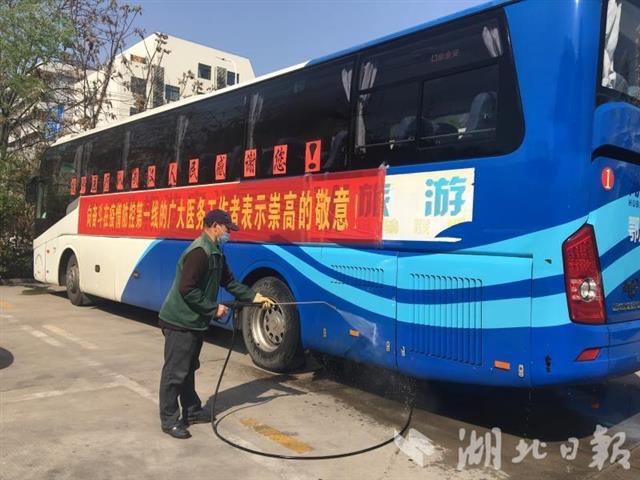 3月16日下午5时,省客集团环保公司经理沈光辉接到集团公司下达的指令:海南、天津、新疆、甘肃、宁夏、山东等省市医疗队3000余名医护人员次日将搭乘包机撤离武汉,需要对80余台大巴车进行消杀保洁,运送医疗队从驻地去机场。