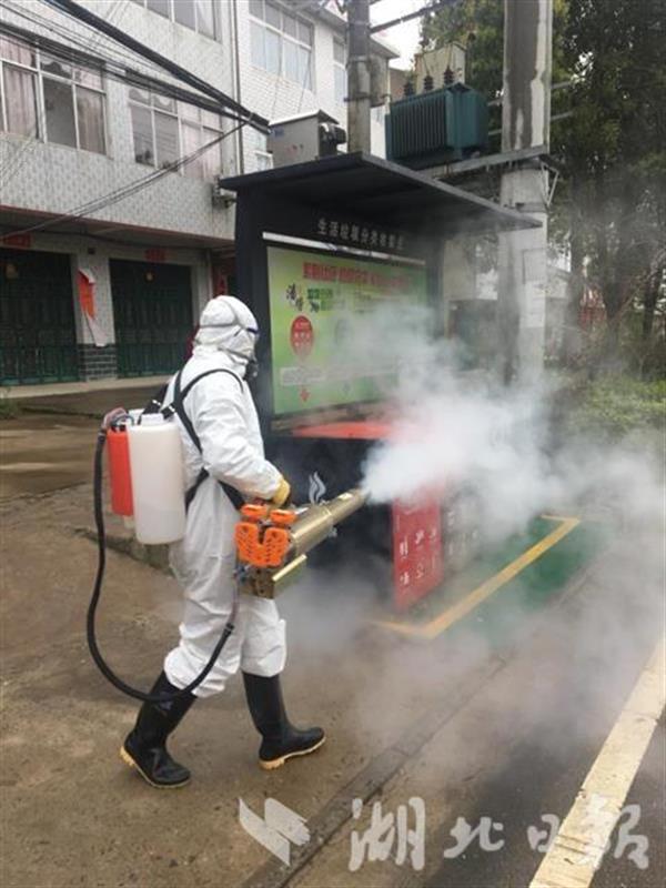 省客集团环保公司消毒人员在武汉新洲区潘塘街消毒。