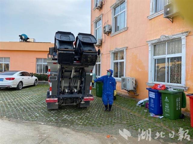 省客集团环保公司消毒人员在新洲区潘塘街转运医疗垃圾和生活垃圾。