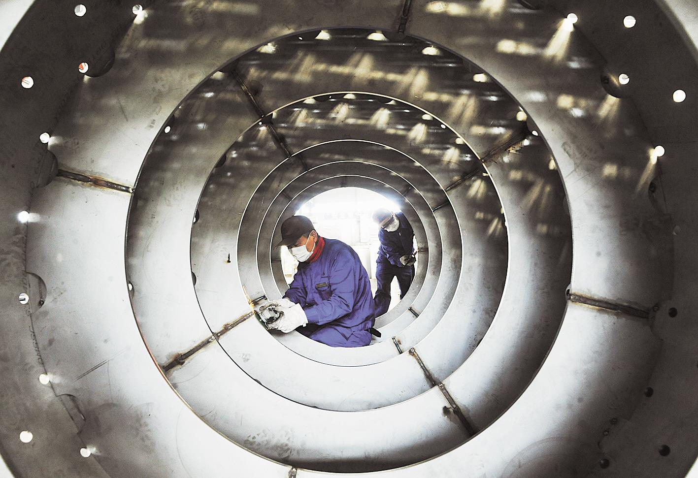 4月9日,位于荆州市的湖北山洪食品机械有限公司车间内,2名工人对真空脱水机转股进行最后的打磨和焊接。该公司是荆州区外向型企业之一,主要生产食品淀粉加工设备,2019年销售收入达5000万元,出口占70% 左右。3月中旬公司复工复产后,克服困难加紧生产,价值3000万元的延后发货出口订单中,已有1700万元订单产品完成生产。