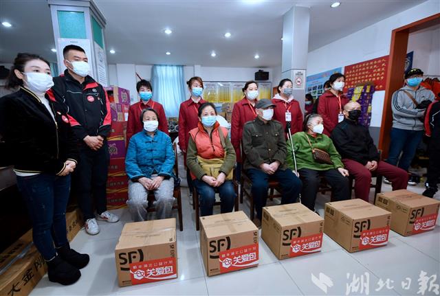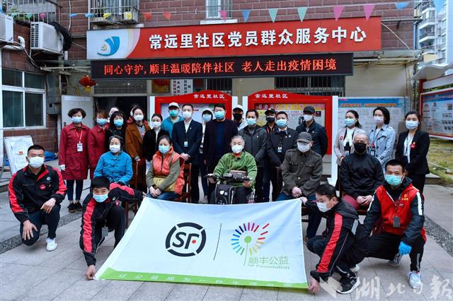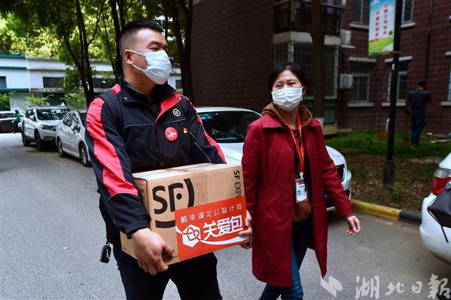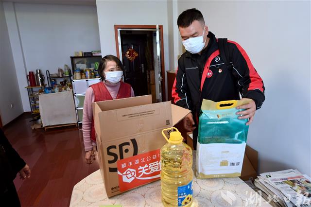 4月10日,由顺丰公益基金发起的“同心守护计划”公益活动在武汉市江汉区汉兴街常远里社区正式启动。包括“最美快递员”汪勇在内的3名顺丰小哥集体化身”社区管家”,为孤寡独居、生活困难、行动不便的老人送去包括米、油、家用消毒液、洗手凝胶、口罩等生活必需品在内的“关爱包”。活动当天,首批50个关爱包顺利送到老人们家中。顺丰公益“同心守护计划”在武汉以社区为单位,征集、建立社区管家志愿者团队,计划为1000名受疫情影响的孤寡独居、行动不便的老人提供日常家庭生活必需物资保障,关切关怀身心健康。(湖北日报全媒记者 李溪 通讯员 何向军 摄)