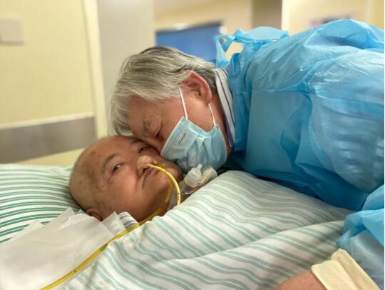 而杭州市中医院重症监护室门口,84岁的黄国琦带着一封刚写好的“情书”,还有几个猕猴桃,缓步走到老伴孙念杰的病床前,边问候边轻吻他的脸颊。这是他们相隔55天后第一次见面。