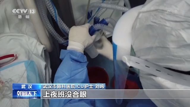武汉市肺科医院ICU护士 刘鸣:上夜班没合(过)眼就一直在旁边守着看着。一个病人连着三四台机子,有的是心电监护的机子,上面有他的血氧饱和度,血压、心率这些值,有些病人病情变化挺快的,本来血压很好,然后突然一下血压就降下来了,我们要及时去处理。