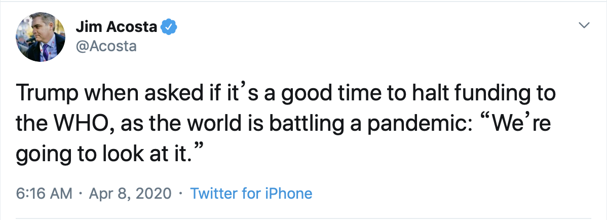 7日,特朗普在白宫疫情简报会上批评世卫组织“对危机反应迟缓”,称该组织“以中国为中心”,并威胁暂停向该组织缴纳会费。8日,特朗普继续指责世卫组织,称正在考虑取消对世卫组织的资金支持。美国国务卿蓬佩奥也指责世卫组织未尽责。9日,美国国务院发言人称,世卫组织“又一次将政治凌驾于公共卫生之上”,美国对此深感不安。