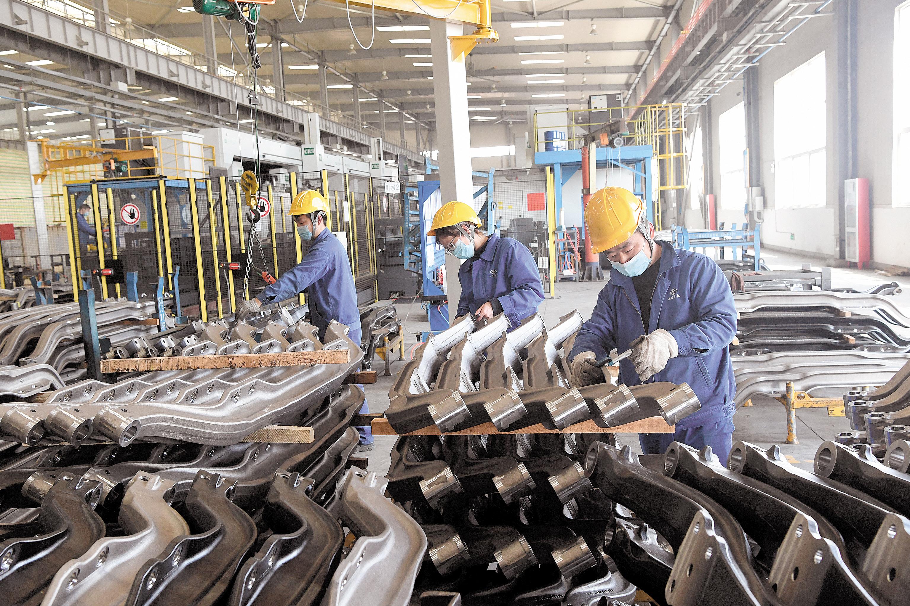 3月31日,湖北三环车桥有限公司谷城工业园厂区,工人在锻造车间生产大货车的前轴和车桥。该公司被列为全省疫情防控重点保障企业之一,克服困难于3月16日全面复工,优化生产方式,超额完成生产任务,保障市场供给。 (湖北日报全媒记者 陈勇 通讯员 刘波 摄)