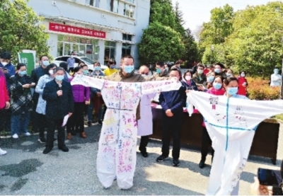 送别仪式上,金银潭医院院长张定宇向江苏医疗队表达感谢,向他们颁发荣誉职工证书,献上鲜花。
