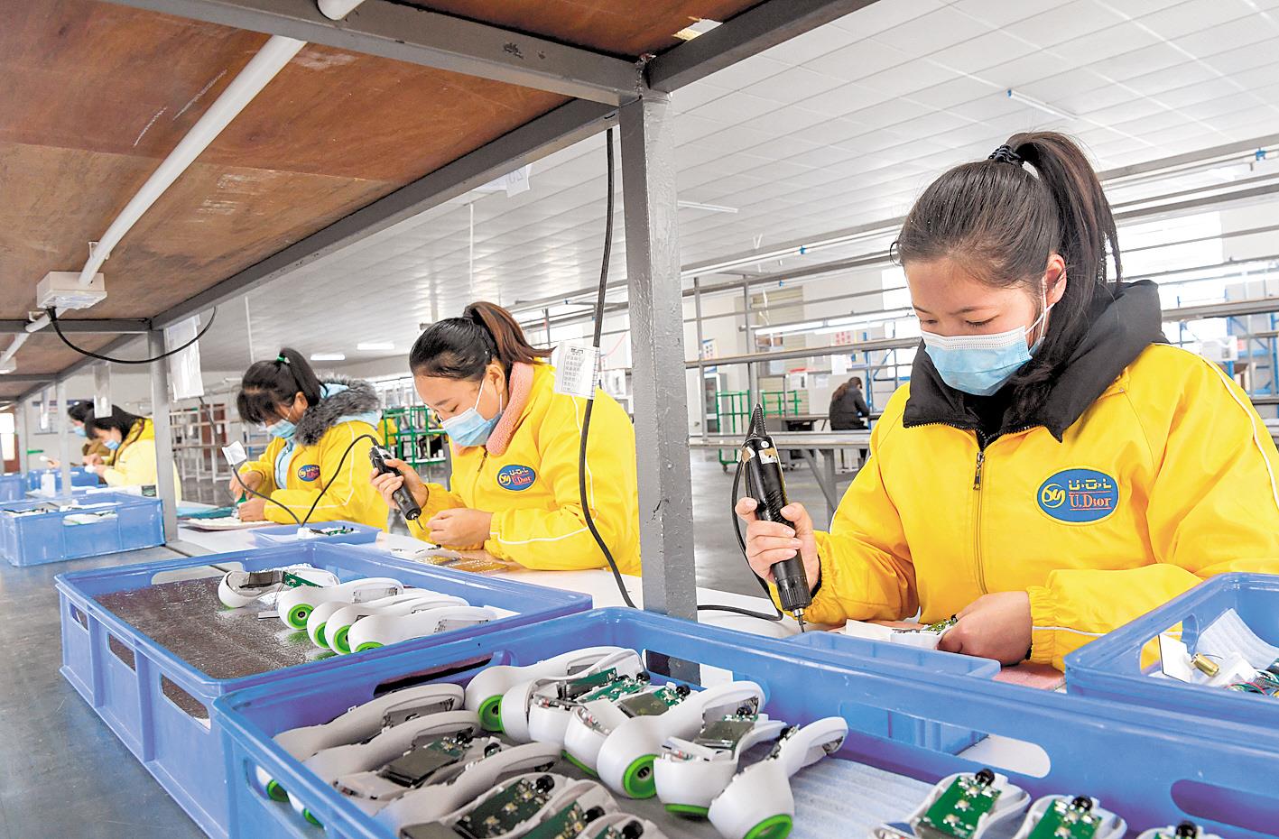 3月31日,在谷城县开发区优迪欧光电科技公司,工人正在装配红外线测温仪。新冠肺炎疫情发生后,这家生产LED灯的电子企业,申报转产红外线测温仪项目,已纳入国家疫情防控物资扩产、转产重点企业名单。目前,该企业正在为出口红外线测温仪准备CE(欧盟)、FDA(美国)和国际标准ISO医疗器械体系认证,已签订和正在洽谈的出口订单超过100万支。