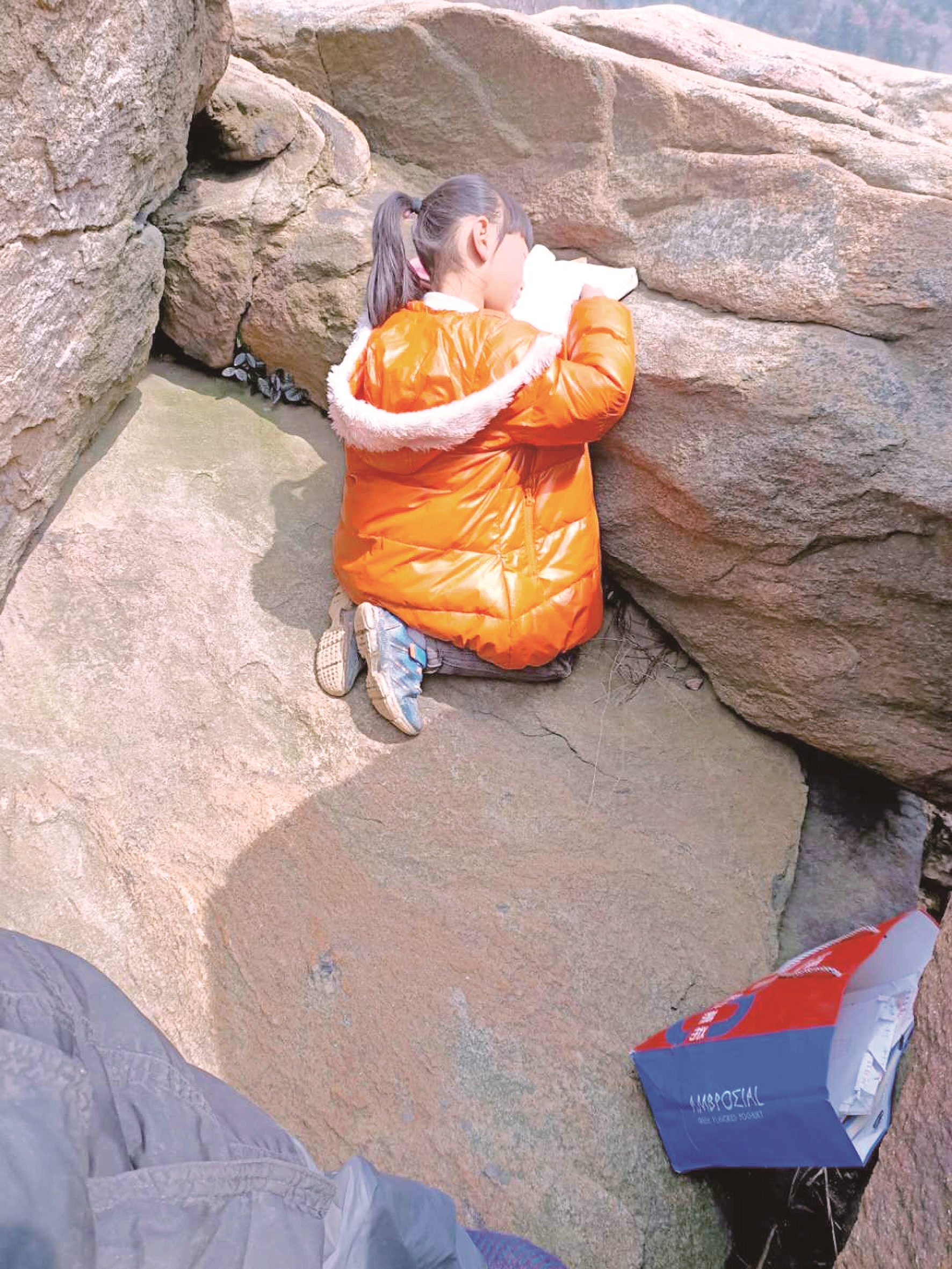 “山洞”其实就是几块巨石之间的夹缝。石缝里比较安全,能避风,还有一块山石形状正好像桌子一样。“以后这就是我的教室啦!”张梓琪对自己的发现很兴奋,趴在“石桌”上学习得很认真。因为带着椅子不方便爬山,她上课时就席地而坐。