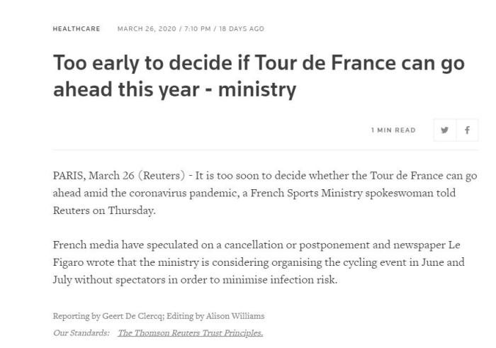 中新网4月13日电 据路透社报道,本赛季的环法自行车赛或将推迟举办。
