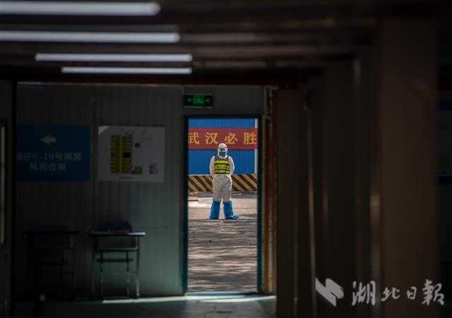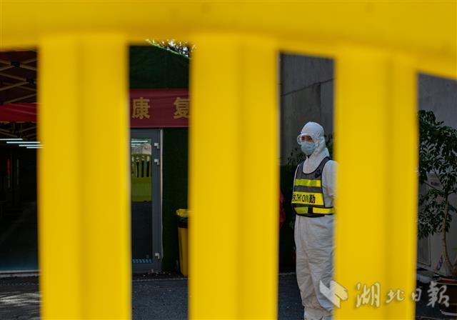 4月13日上午,武汉市长江新城康复驿站,一名安保人员最后坚守岗位。当日,最后7位康复隔离人员结束隔离观察,该驿站随后宣布关闭。根据要求,出院新冠肺炎患者需要统一接受为期14天的康复隔离观察,并经两次核酸检测均为阴性且无临床表现的,方能回家。该康复驿站是武汉市规模最大的康复驿站,由原未投入使用的长江新城方舱医院改造而成,3月3日启用以来,先后共接收1419名康复人员。(湖北日报全媒记者 魏铼 通讯员 唐时杰 摄)