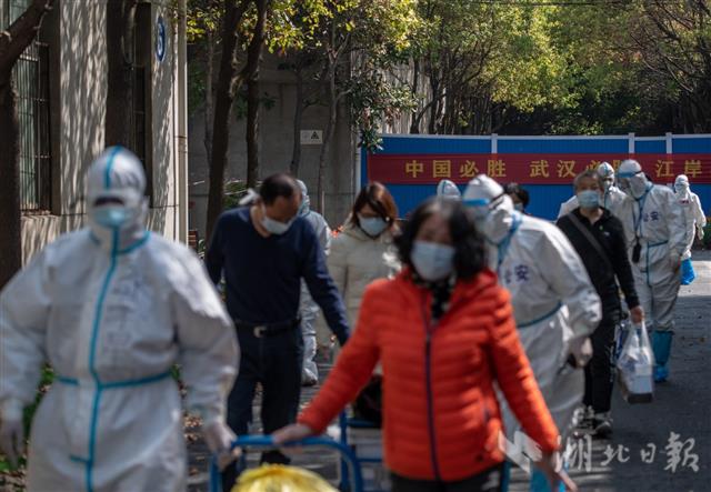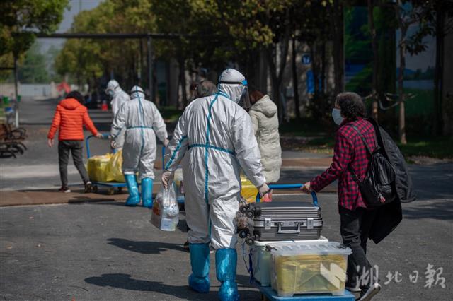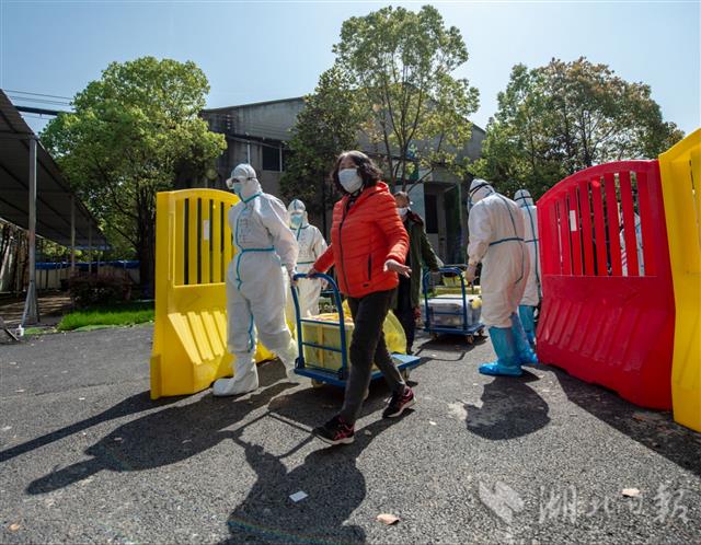 4月13日上午,武汉市长江新城康复驿站,工作人员带着康复隔离人员走出隔离区。