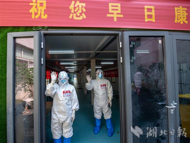 4月13日上午,武汉市长江新城康复驿站,送走康复隔离人员的医务人员挥手告别。