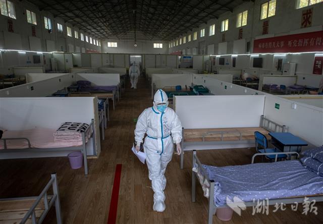 4月13日上午,武汉市长江新城康复驿站,工作人员反复检查即将关闭的驿站生活区。