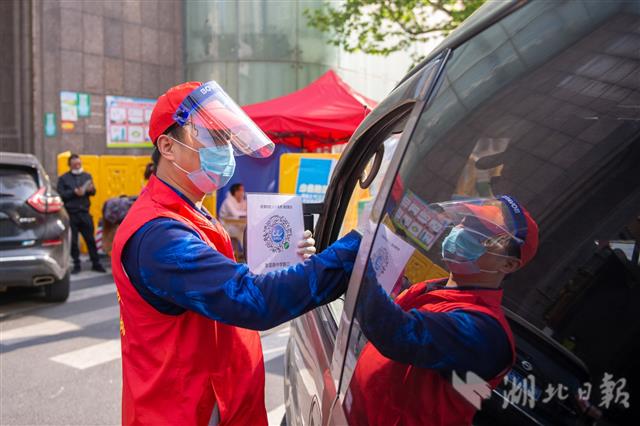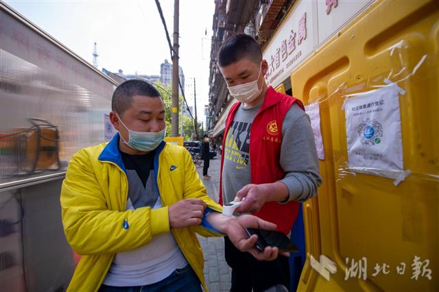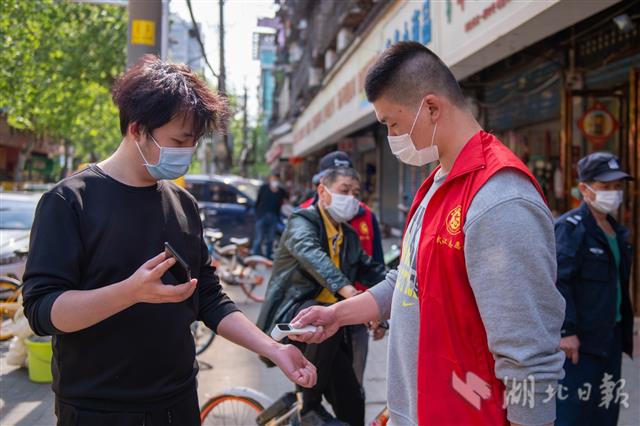 4月13日,武汉市江汉区友谊社区,志愿者核验居民健康码并测量体温。
