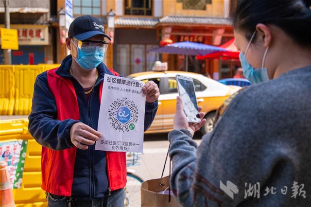 4月13日,武汉市江汉区友谊社区,居民扫码进出小区。该社区是无疫情社区,连日来,社区工作者、志愿者每天24小时值守卡口,居民需凭健康码,经体温检测合格后才能进出小区。(湖北日报全媒记者 蔡俊 摄)