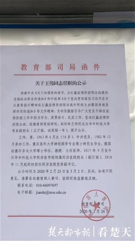 2月24日,教育部人事司发布《关于王伟同志任职的公示》,公示内容显示:“根据中央《关于加强党的领导、为打赢疫情防控阻击战提供坚强政治保证的通知》和中组部《关于坚决贯彻落实习近平总书记重要指示精神在打赢疫情防控阻击战中积极主动履职有效发挥作用的通知》等文件精神,为切实激励引导广大党员干部在疫情防控工作中担当作为、英勇奋斗、扎实工作,坚决打赢疫情防控阻击战,经教育部党组研究,拟任命王伟同志为华中科技大学常务副校长(正厅级,试用期一年)。现予公示。”