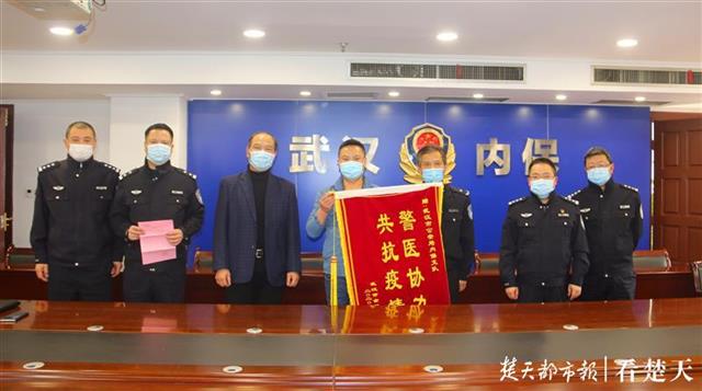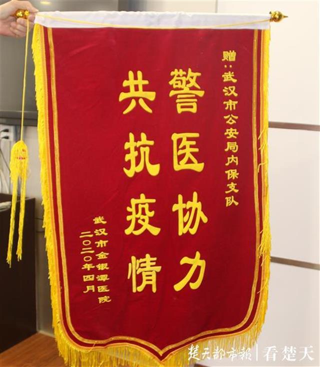 楚天都市报4月14日讯(记者吴昌华 通讯员吴艳)4月13日下午,武汉市金银潭医院副院长桂林在保卫科长周德义的陪同下来到武汉市公安局内保支队,将写着“警医协力、共抗疫情”的锦旗和一封感谢信送到支队长刘选荣手中:“真的谢谢你们!抗疫情的这段时间,你们不畏艰险,一直和我们站在一起,为我们提供了很大的帮助。”刘选荣忙说:“您客气了,特殊时期,这是我们应该做的!”