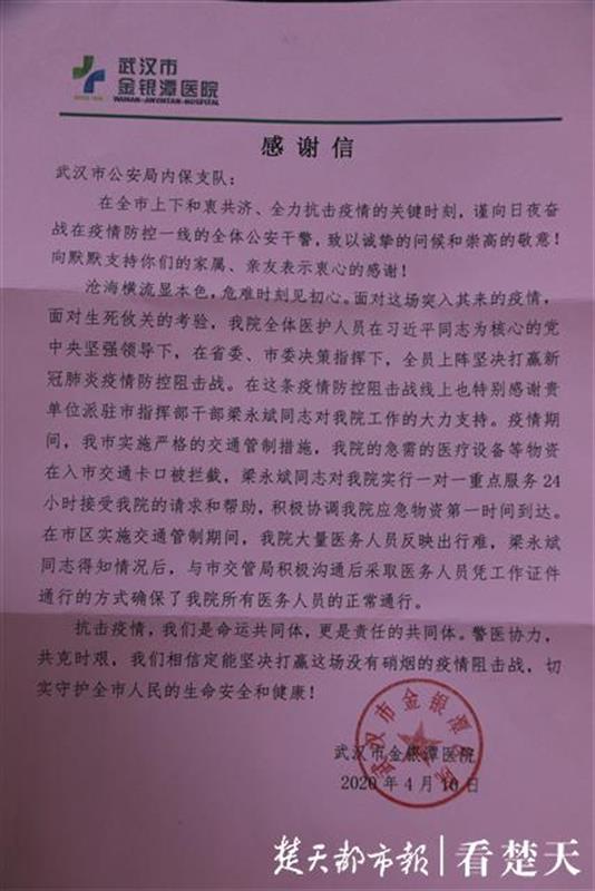 在这场“战疫”中,内保民警们无休的工作、日夜的坚守、热情的服务,尽心的付出让医护人员们看在眼里、暖在心里。一声道谢、一面锦旗,一封感谢信表达了一份感激之情,更代表了医护人员对武汉警察奋战防疫一线、尽职尽责服务的肯定。