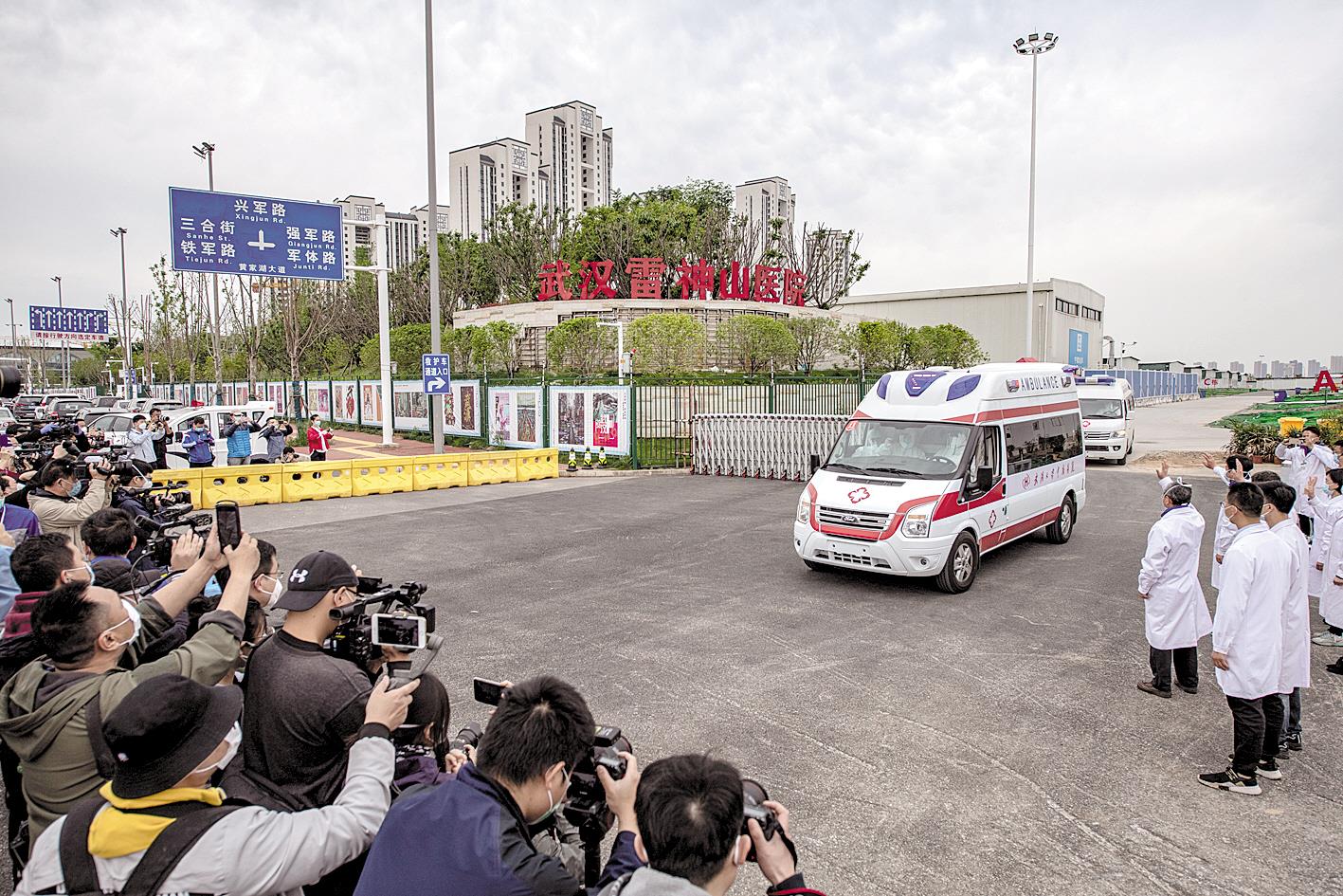 4月14日上午,运载最后4名转院患者的救护车驶离雷神山医院。 (湖北日报全媒记者 魏铼 通讯员 李晗 摄)