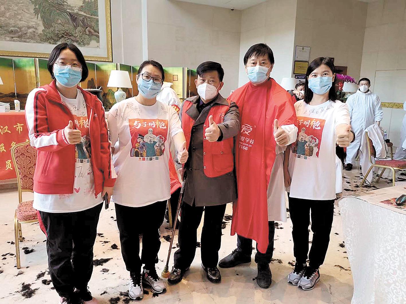宋忠桥(中)在中南花园酒店为河北援鄂医疗队队员剪发后合影。 (图片由受访者提供)
