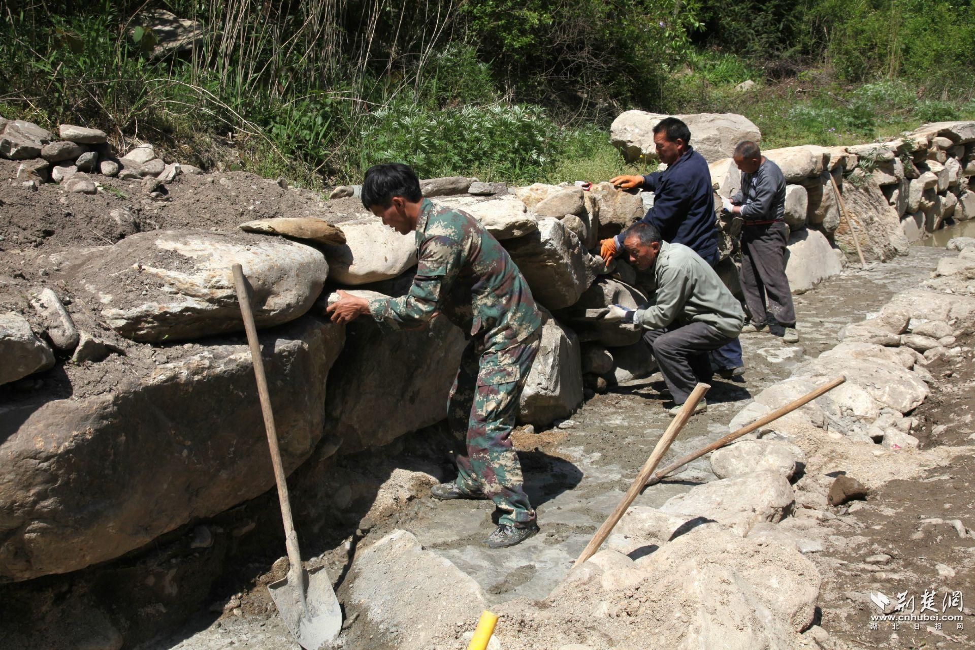 张建武(左一)带领员工在兴建景区人行步道。帅瑜 摄