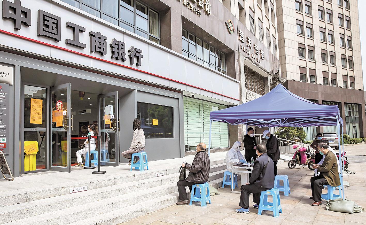 四月十四日,中国工商银行武昌东亭支行营业厅大门口,工作人员对前来办理业务的市民进行信息登记并测量体温。 (湖北日报全媒记者 梅涛 摄)