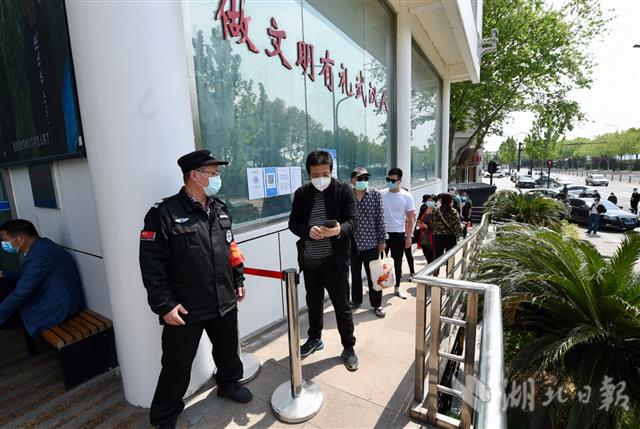 2020年4月16日,武汉市武昌区行政服务中心,前来办事的市民在门口间隔1米排队,经核验健康码、测体温、核实预约信息后有序入内。