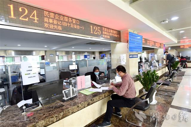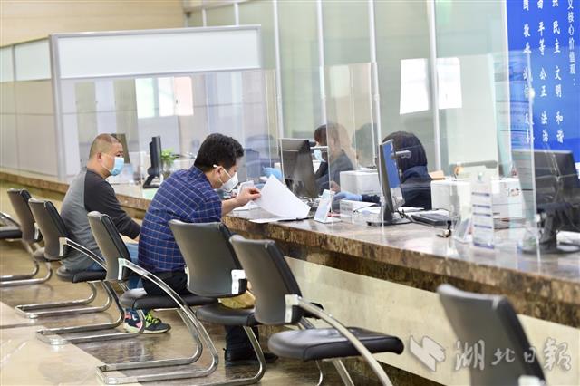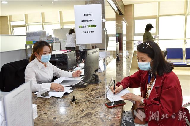 2020年4月16日,武汉市武昌区行政服务中心,前来办事的市民在门口间隔1米排队,经核验健康码、测体温、核实预约信息后有序入内。中心每层楼同时进入办理业务的市民不超过20人,不动产类办事窗口每小时仅受理4名已预约市民办理业务。为避免出现办事人员密集,该中心力推“网上办”、非接触审批,建议非必要不来现场,对有紧急、特殊业务必须线下办理的,提前预约后再到现场办理,即办即走。图为所有窗口柜台上,都安装了一个约1.2米高的透明挡板。(湖北日报全媒记者 李溪 摄)