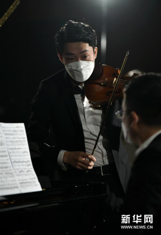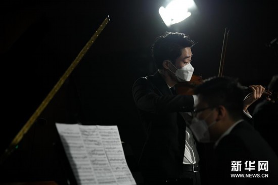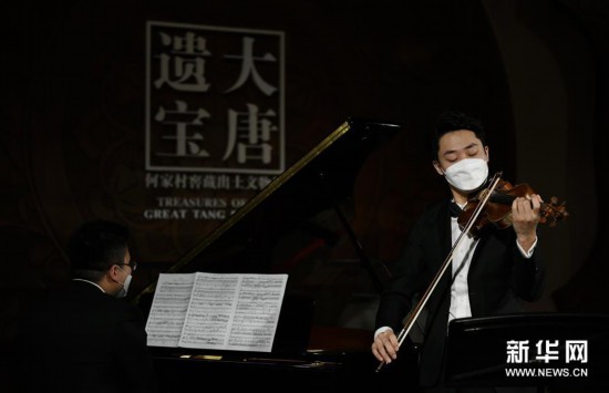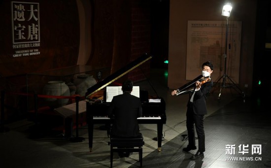 4月14日,西安交响乐团的十余位演奏家在陕西历史博物馆大唐遗宝展厅为即将于4月18日举行的首场“云上国宝”音乐会进行彩排,这是西安交响乐团小提琴首席周虎翼(右)在进行排练。 新华社记者李一博摄