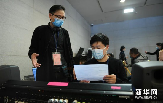 4月14日,西安交响乐团的十余位演奏家在陕西历史博物馆大唐遗宝展厅为即将于4月18日举行的首场“云上国宝”音乐会进行彩排,这是技术人员在调试设备。 新华社记者李一博摄