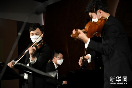 4月14日,西安交响乐团的十余位演奏家在陕西历史博物馆大唐遗宝展厅为即将于4月18日举行的首场“云上国宝”音乐会进行彩排,这是西安交响乐团小提琴首席周虎翼(右)、第二小提琴首席白东旭(左)和钢琴乐手程飞(中)在进行排练。 新华社记者李一博摄